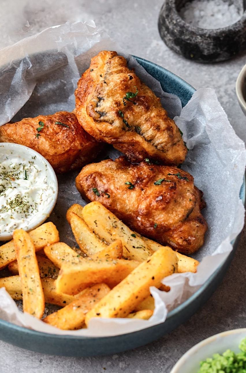 Serve with chips, minty mushy peas and vegan tartare sauce!
